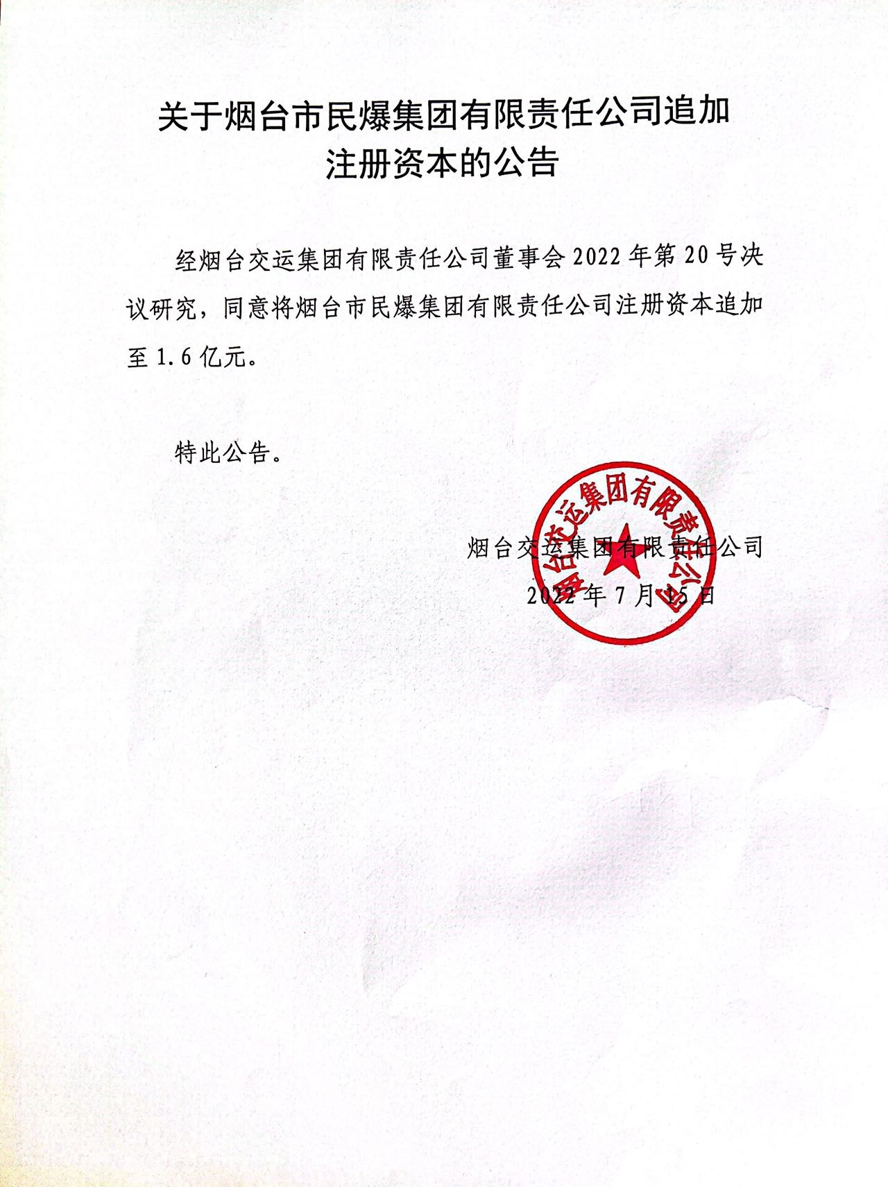 關(guān)于煙臺市民爆集團有限責(zé)任公司追加注冊資本的公告