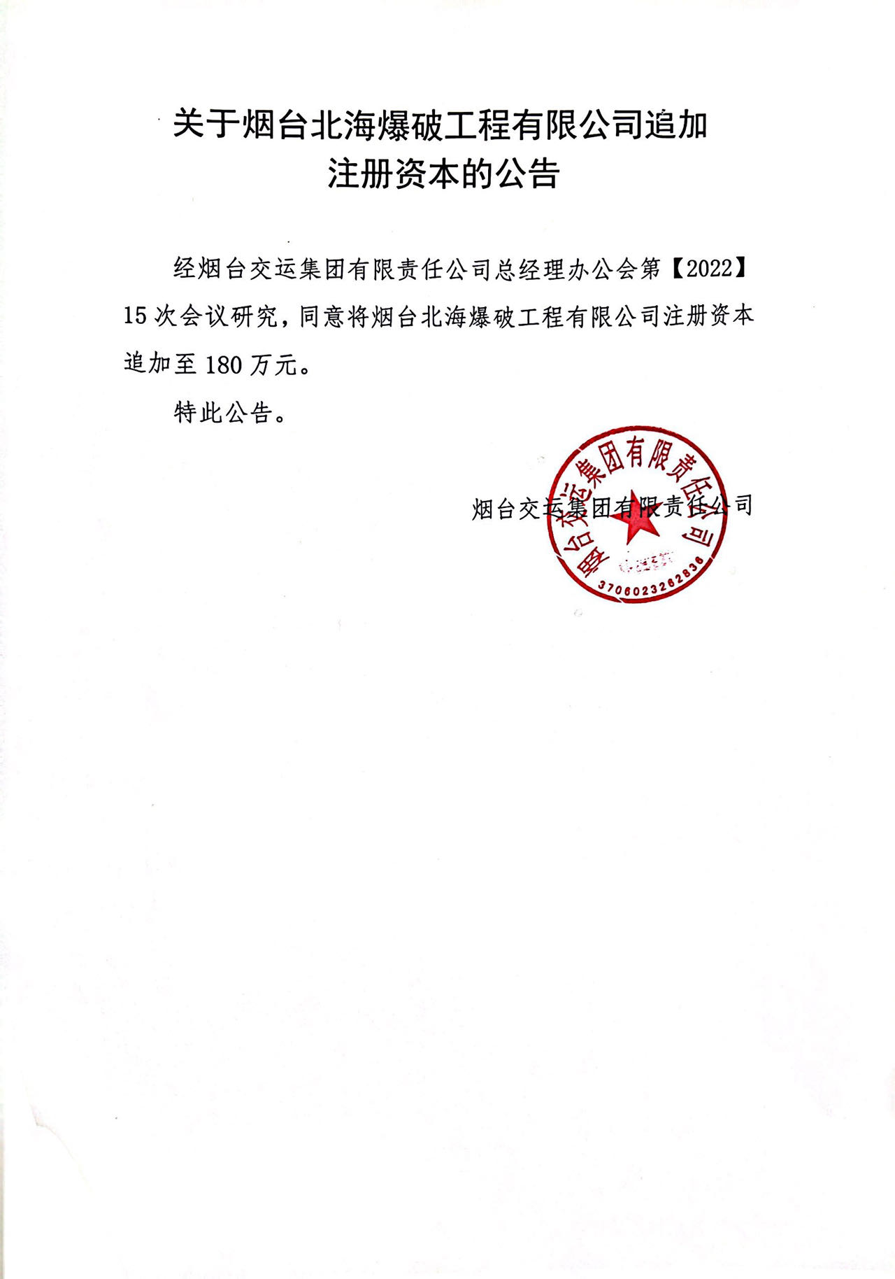 關于煙臺北海爆破工程有限公司追加注冊資本的公告